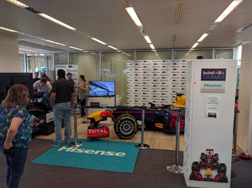 在发布会现场,海信携其赞助的红牛F1方程式赛车向参观者展示了海信电视和冰箱产品,大型赛事体育营销再次契合了海信品牌的国际化。现场,结合海信65寸M7000电视设置了F1赛车游戏模拟器,试驾成绩第一名即有机会前往红牛赛车总部。此举吸引了大量参观者前来体验和咨询,也让更多人真实感受到了海信电视的品质魅力。