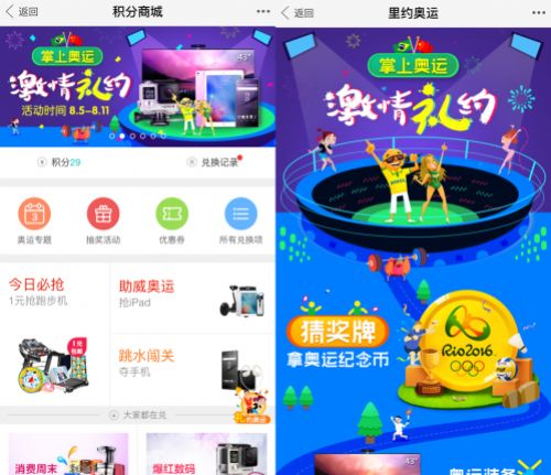 (搜狗搜索APP“积分商城”和“奥运互动游戏”截图)