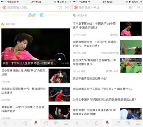 (搜狗搜索APP奥运专题“热点一览”和“微信头条”板块截图)