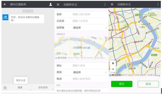 首先在微信中关注“腾讯位置服务”公众账号,然后按照操作提示完成相关信息的录入,通过审核后数据就可以上线发布了。这一方式对于中小微商户来说,几乎没有任何成本,商户的准确信息就可以在腾讯地图、微信位置分享等腾讯自有产品中第一时间得到体现。